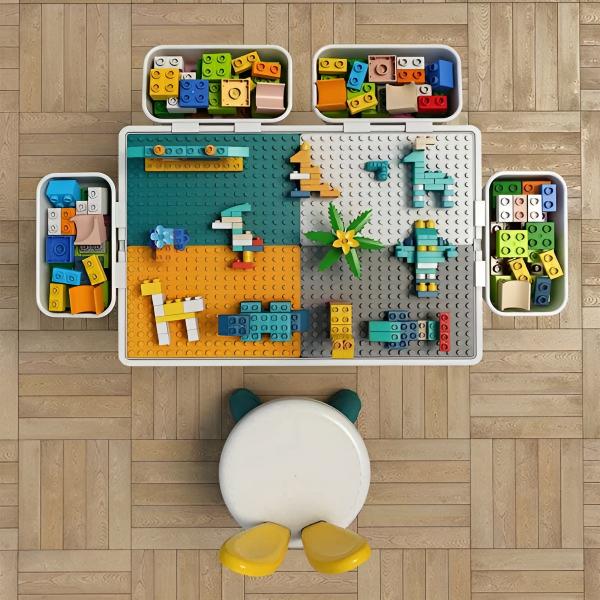 Масата може да се използва и от двете страни, като едната е предназначена за сглобяване на блокчета, а другата е с плоска повърхност.