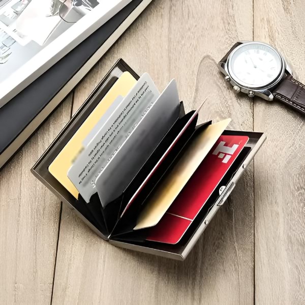 Изработен от висококачествена неръждаема стомана, този портфейл е по-издръжлив и дълготраен от пластмасовите или алуминиевите варианти, като предлага превъзходна защита за вашите карти.