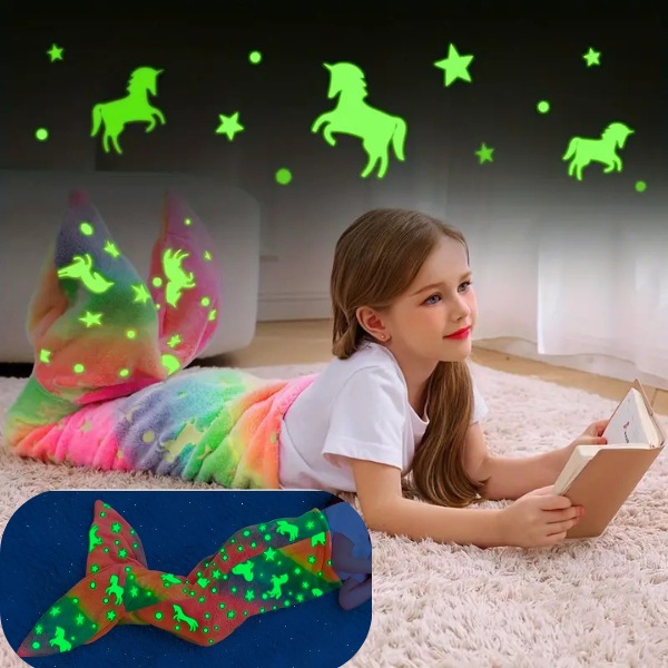Одеялото MERMAIDREAM свети в тъмното, осигурявайки успокояваща светлина, за да облекчи нощните страхове. Просто го изложете на дневна светлина за 20 минути и то ще свети меко през цялата нощ. Изберете дизайн с опашка на акула или опашка на русалка за допълнителна магия, докато детето ви спи.