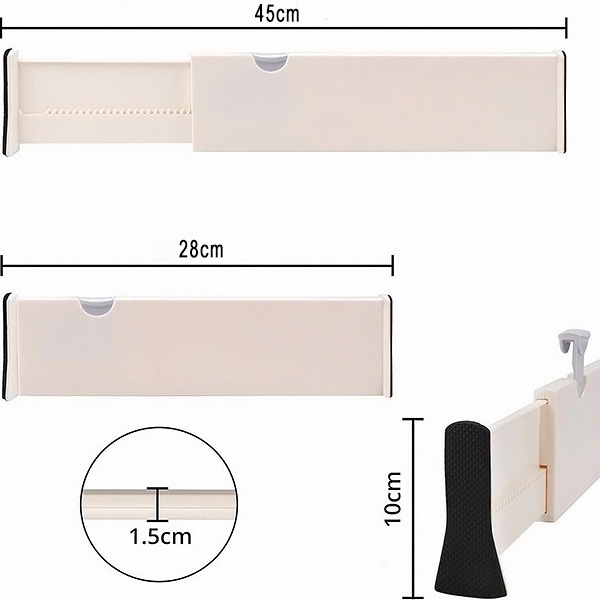 Независимо дали става въпрос за кухненски прибори, тоалетни принадлежности за баня или чорапи в спалнята – тези разделители се регулират от 28 см до 45 см, за да паснат на повечето размери чекмеджета. Можете да организирате пространството си точно както желаете.